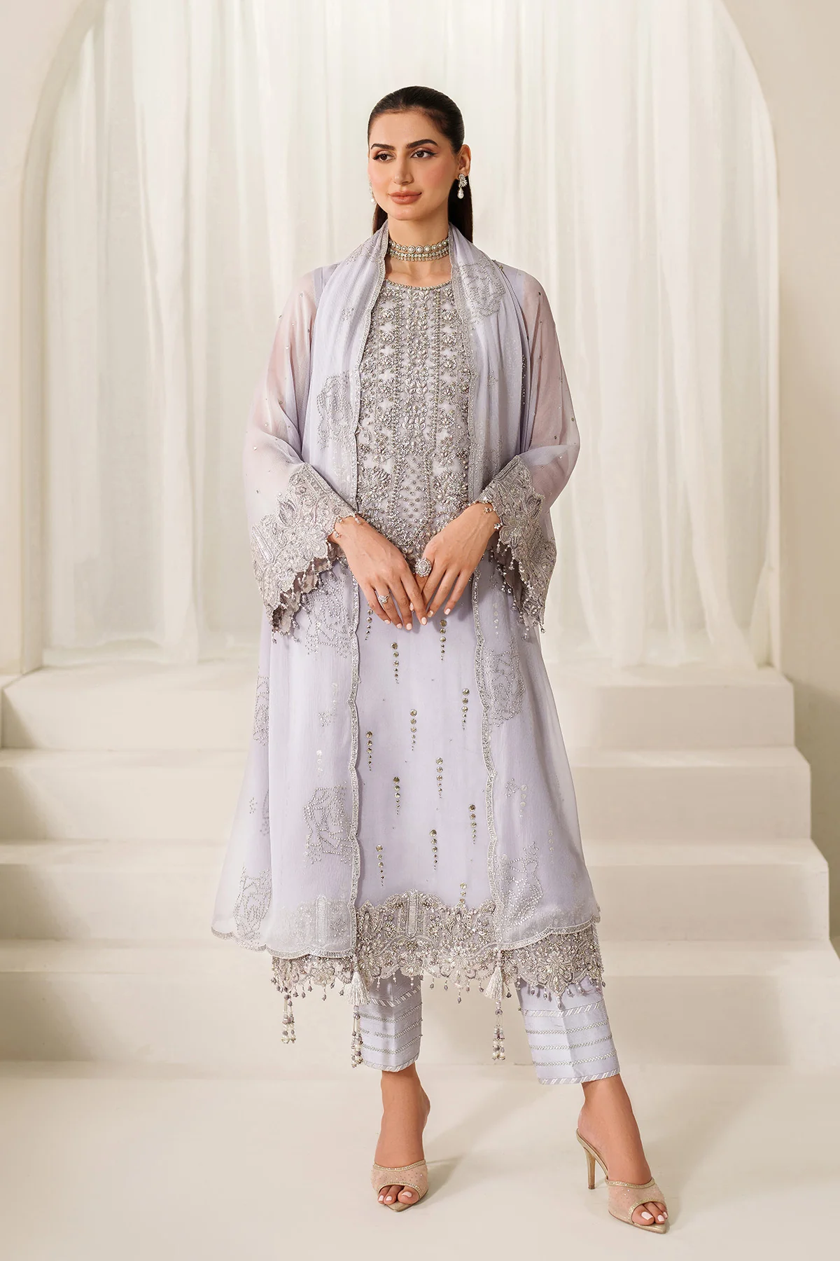 Step into elegance with this ethereal lavender grey ensemble, crafted with finesse and adorned with traditional artistry. The front bodice features intricate Mukesh work, adding a subtle sparkle and regal grace. Chiffon sleeves bring a delicate transparency, while the dyed raw silk trousers anchor the look with a refined finish. Finished with exquisite detailing and embellishments on the hem, this design blends tradition and modernity effortlessly