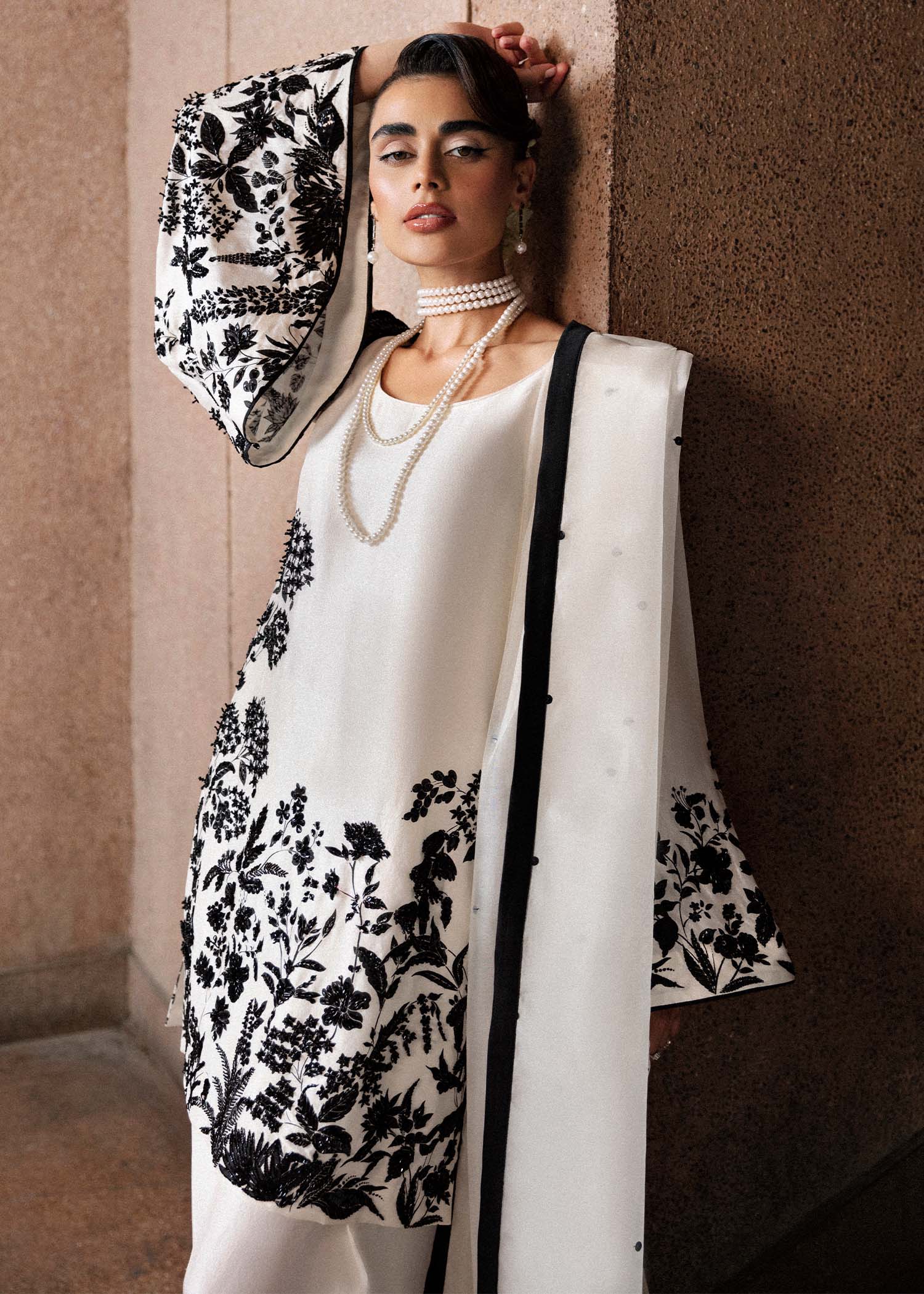 A beautiful ivory raw silk shirt with round and deep neckline, and heavily adorned front , back and sleeves with black embellishment of sequins , pipes, buggle beads, pearl and swarovskis. It is paired with a classic printed ivory shalwar with black embellishment. The 3 yards organza dupatta has black sequin spray finished with black satin on all 4 sides.