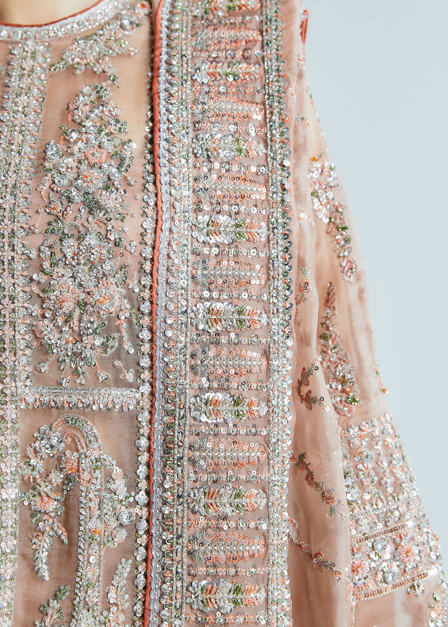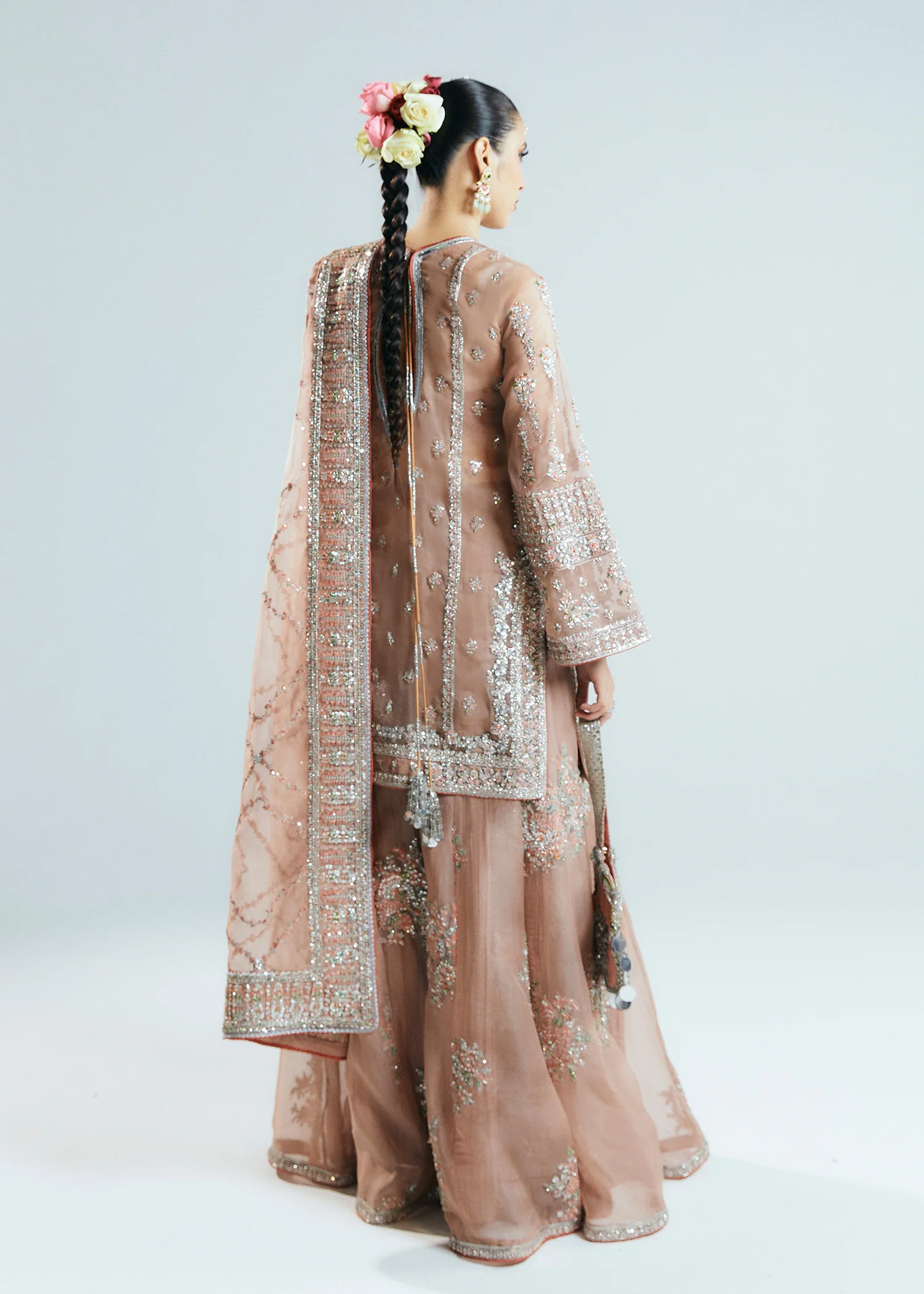 A classic nude organza short shirt crafted with exceptionally intricate embellishment of handwork pairing with organza embellished sharara with crushed medium silk lining. To complete the grandeur look it comes with organza dupatta with heavily embellished borders on four sides.