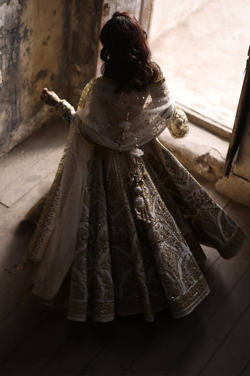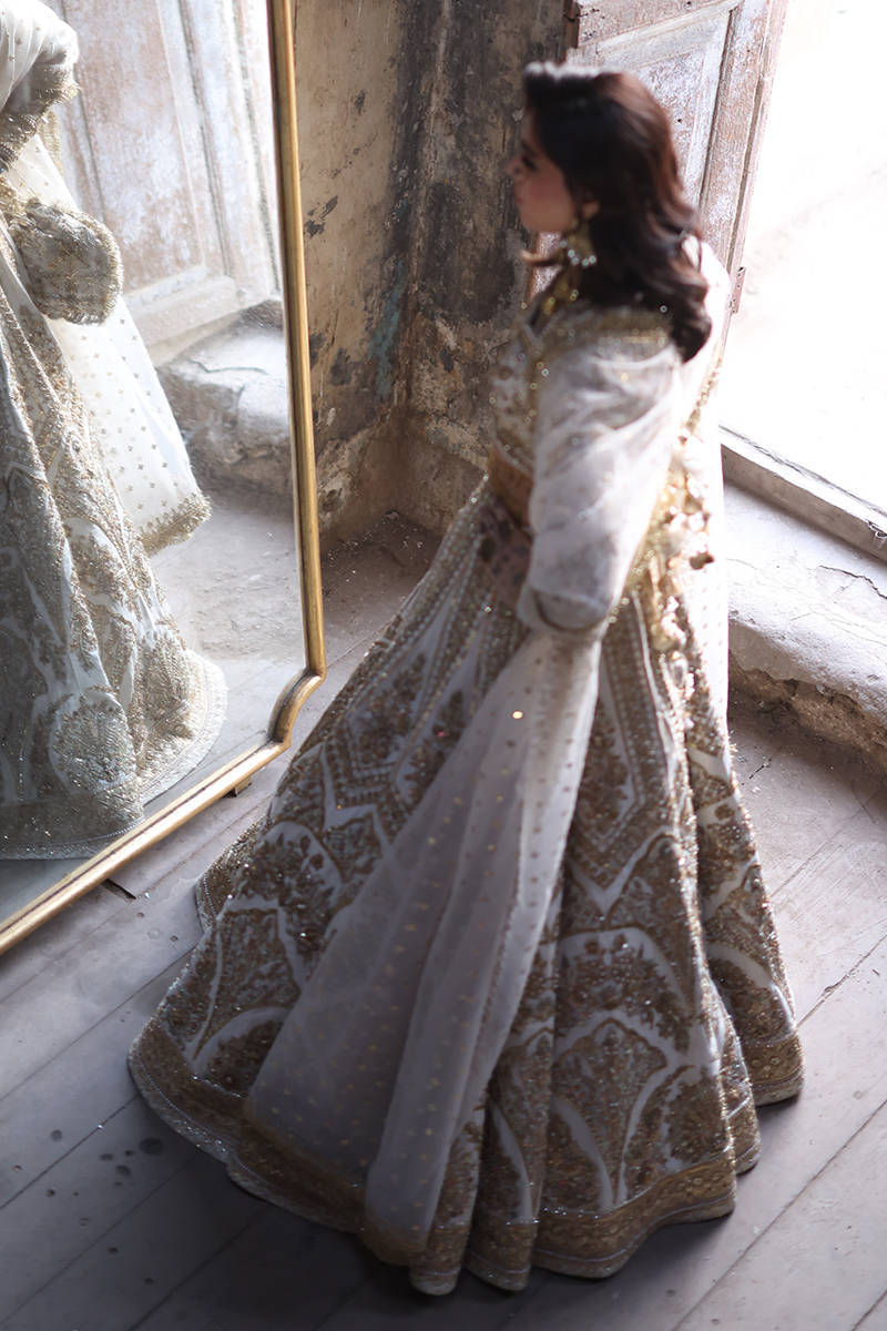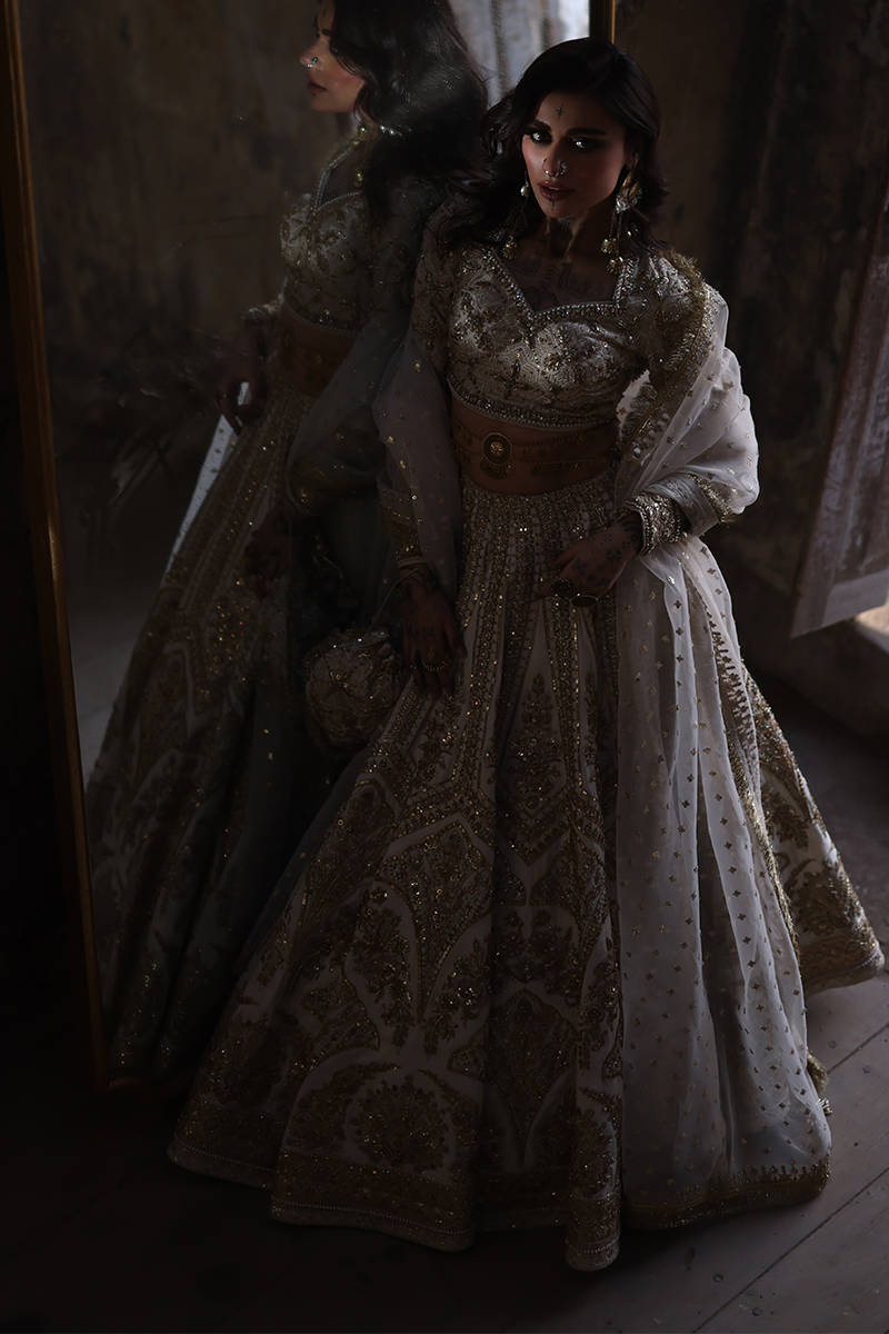 Illuminate any occasion with “Bibbojaan” in pearl white and gold from the Gold Series Hussan Ara Mansion Collection by Mohsin Naveed Ranjha. This couture masterpiece features a heavily embellished Italian silk choli, adorned with exquisite multihead embroidery and net fabric sleeves detailed with motifs and borders inspired by timeless Mughal frescoes. Paired with a luxurious lehenga showcasing intricate multihead embroidery and heavy adda work on an Italian silk base, it radiates opulent craftsmanship. Completing this regal look are two ethereal dupattas – one in organza with lavish embellishments and four-sided embroidered borders, and another with delicate sequin spray and light embroidered borders. An embroidered silk pouch with Jamawar accents adds the perfect finishing touch, making this ensemble a true statement of luxury and tradition.