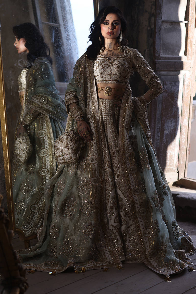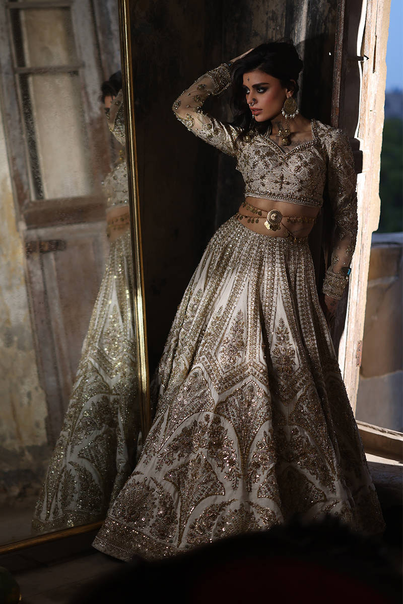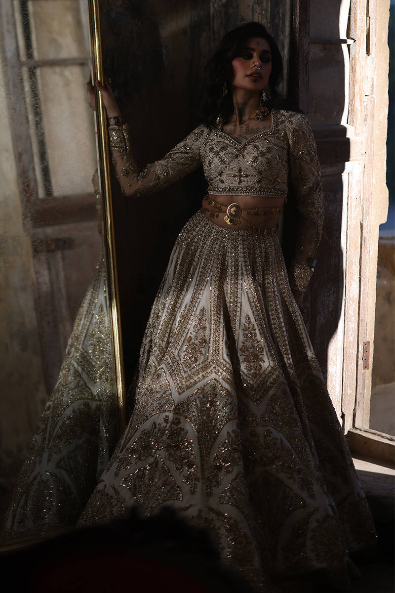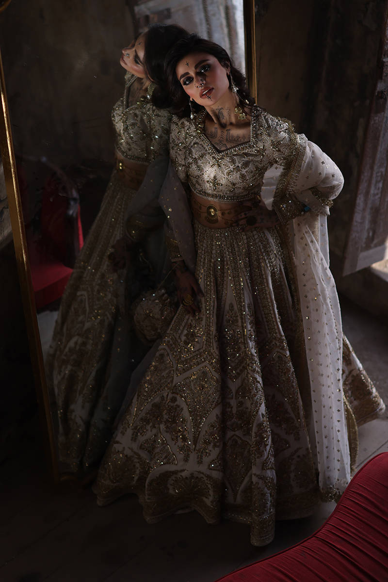Illuminate any occasion with “Bibbojaan” in pearl white and gold from the Gold Series Hussan Ara Mansion Collection by Mohsin Naveed Ranjha. This couture masterpiece features a heavily embellished Italian silk choli, adorned with exquisite multihead embroidery and net fabric sleeves detailed with motifs and borders inspired by timeless Mughal frescoes. Paired with a luxurious lehenga showcasing intricate multihead embroidery and heavy adda work on an Italian silk base, it radiates opulent craftsmanship. Completing this regal look are two ethereal dupattas – one in organza with lavish embellishments and four-sided embroidered borders, and another with delicate sequin spray and light embroidered borders. An embroidered silk pouch with Jamawar accents adds the perfect finishing touch, making this ensemble a true statement of luxury and tradition.