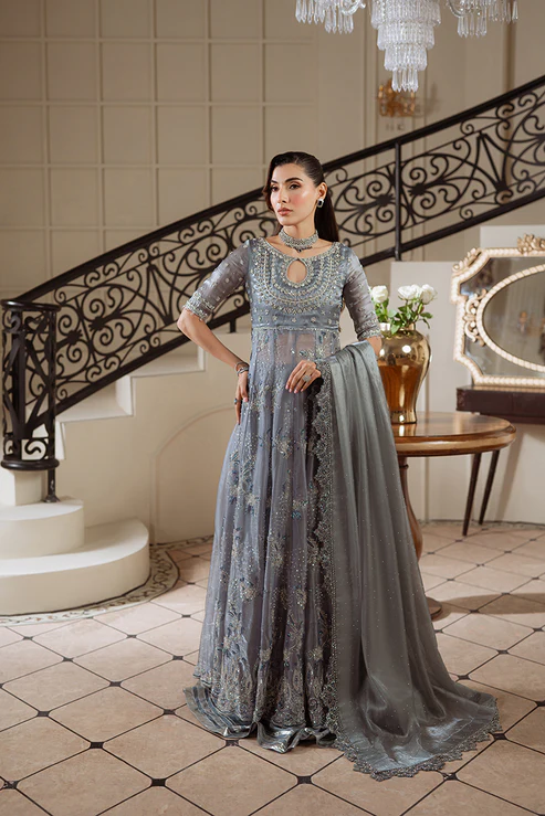 This grey-blue gown reflects the elegance of Queen Rania, often seen in this serene hue. Crafted from organza silk, the gown features hand-embellished zardozi, katdana, and sequins with button detailing. The long, flowy design is paired with raw silk flared sharara pants, adorned with silver zardozi work. A handmade dupatta with stone-crafted flowers adds a final touch of sparkle, making this ensemble a perfect blend of royal grace and intricate craftsmanship.