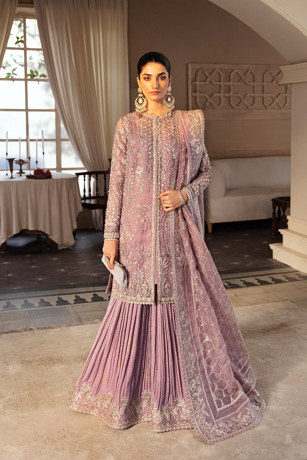 A perfect embodiment of celebration, ‘Sehr’ a graceful ensemble, featuring the timeless charm of dusty mauve. This lavishly adorned Organza Jacket and airy drape dupatta with enchanting screen print, is skillfully adorned with intricate hand embellishments work, pairied with a Crushed Sharara, adding a touch of traditional work.